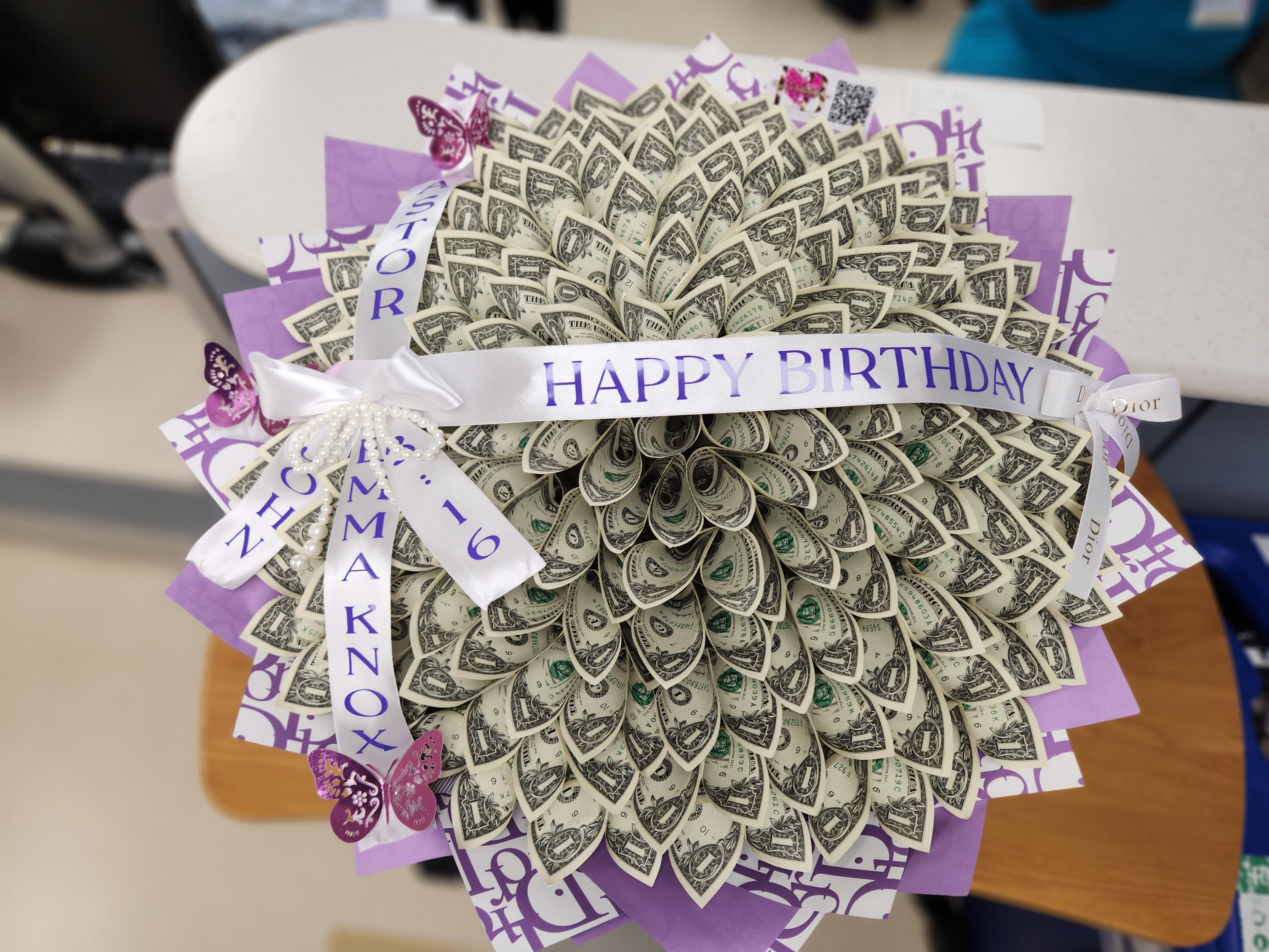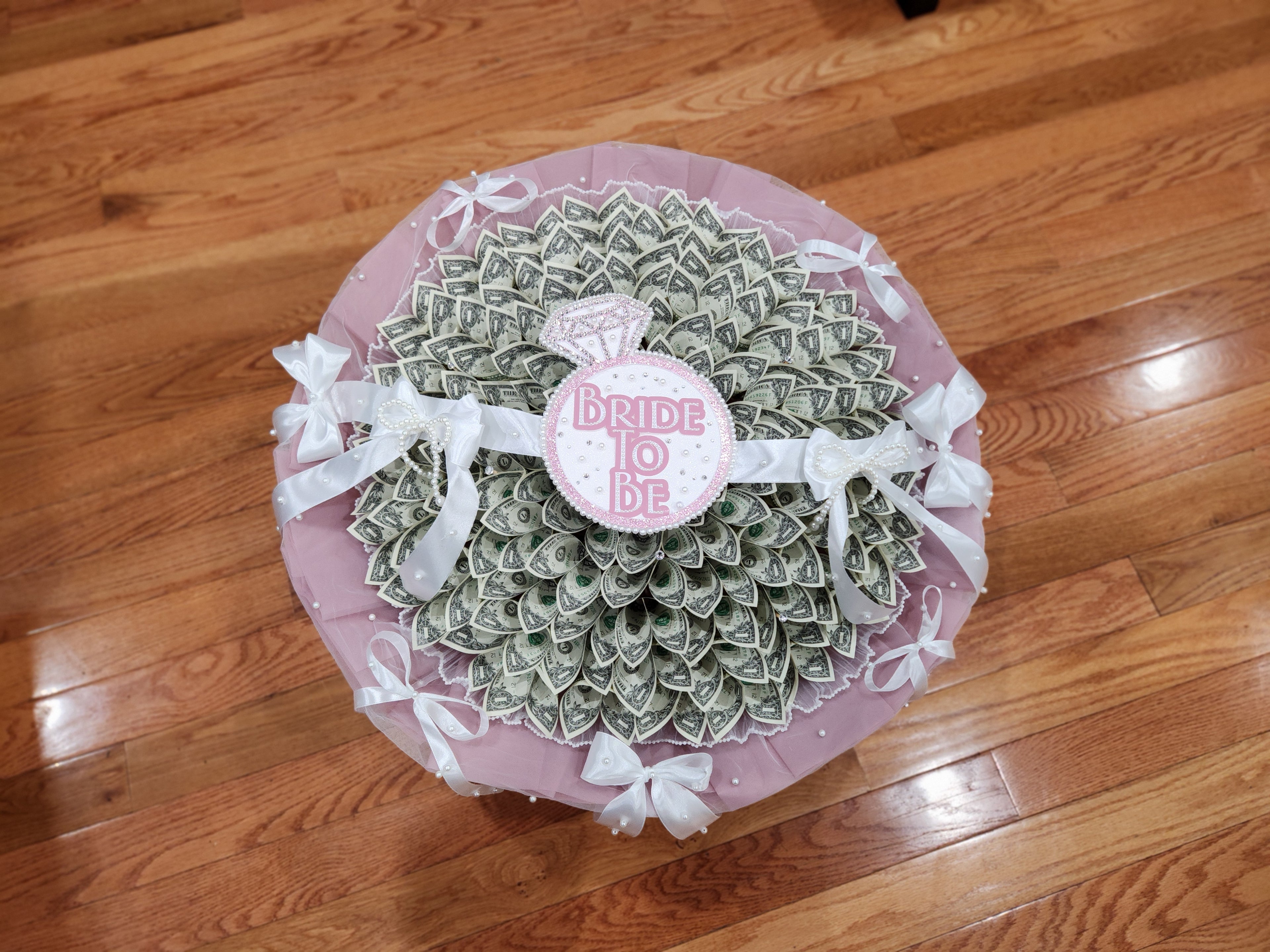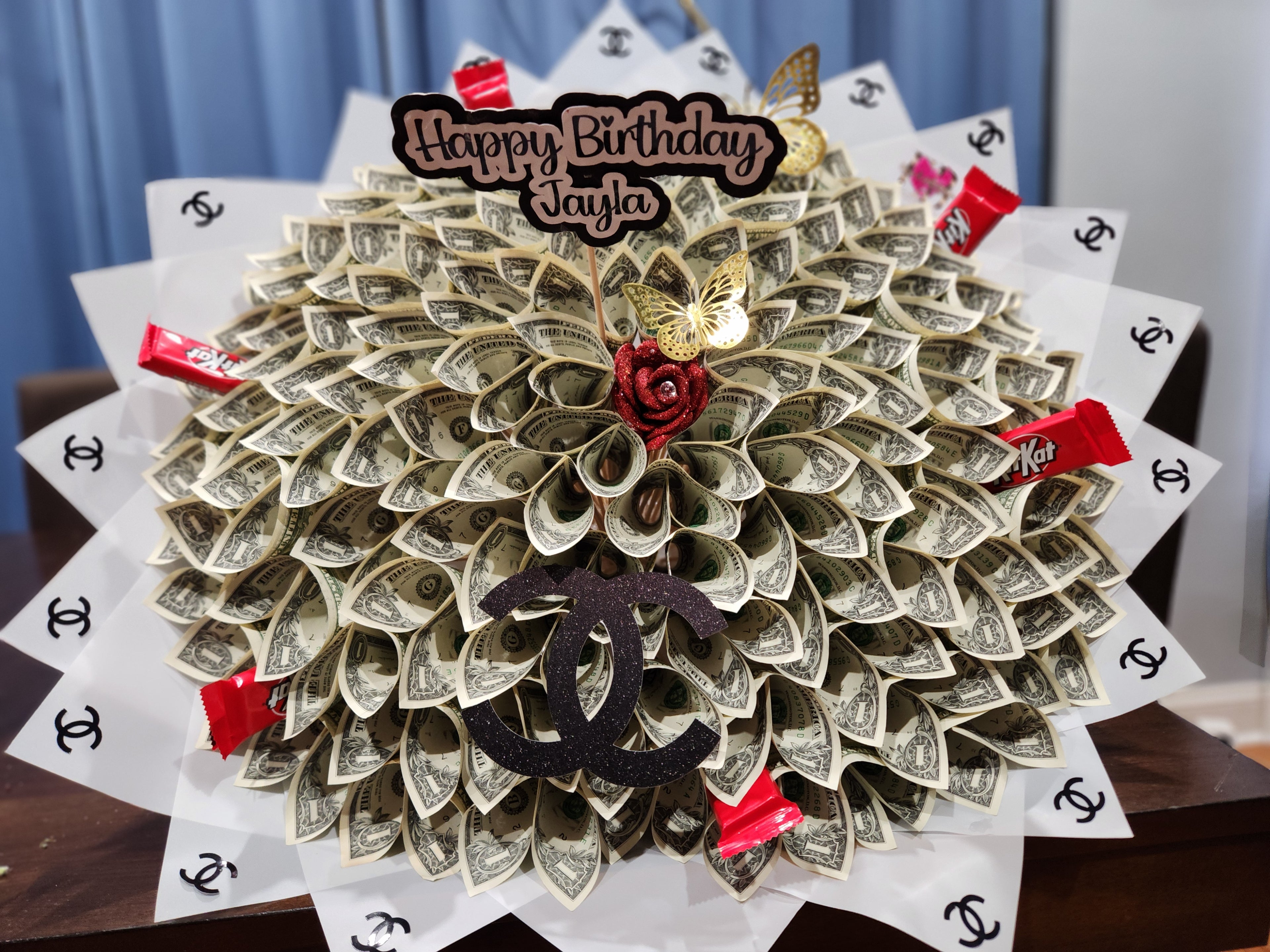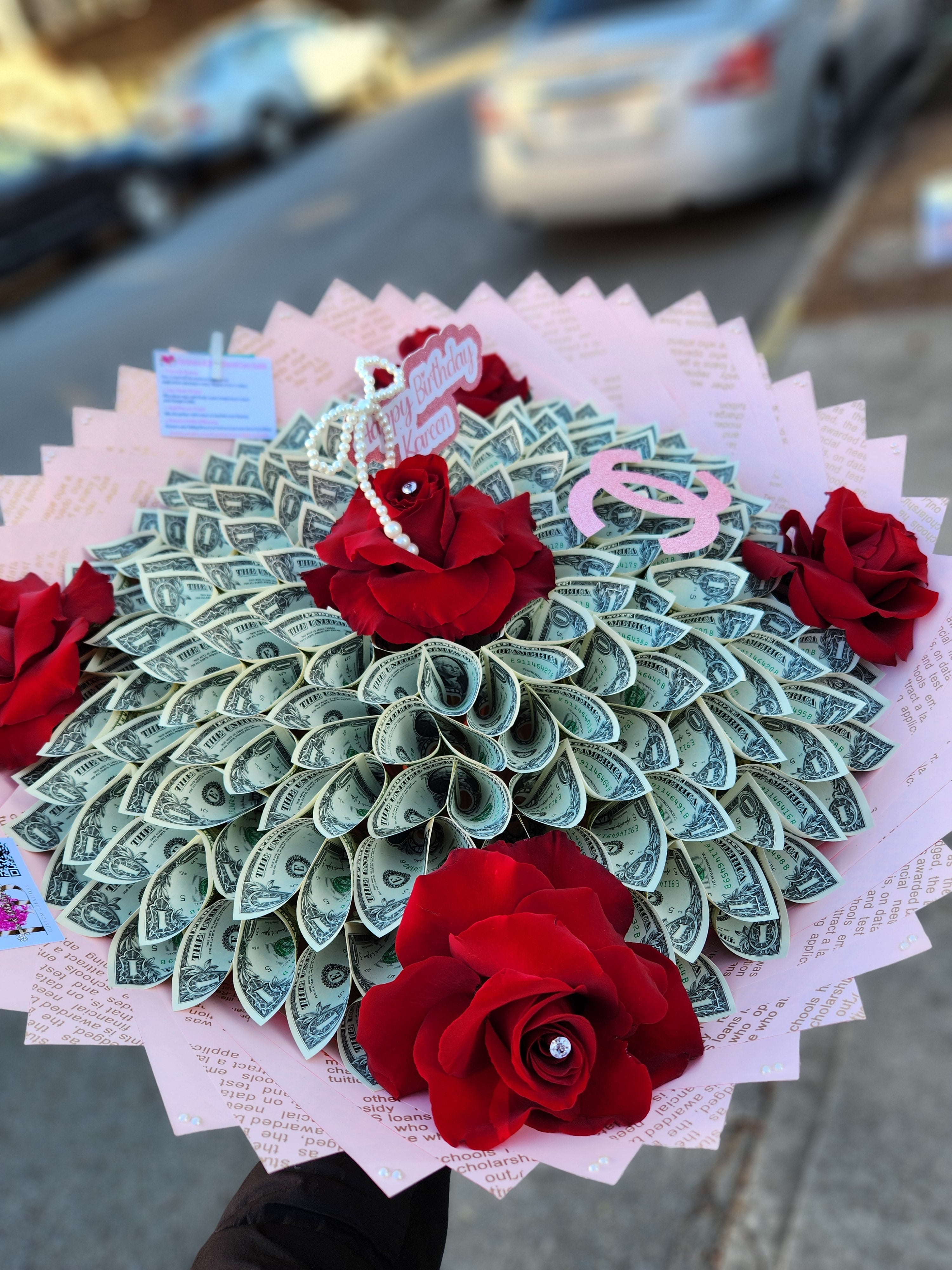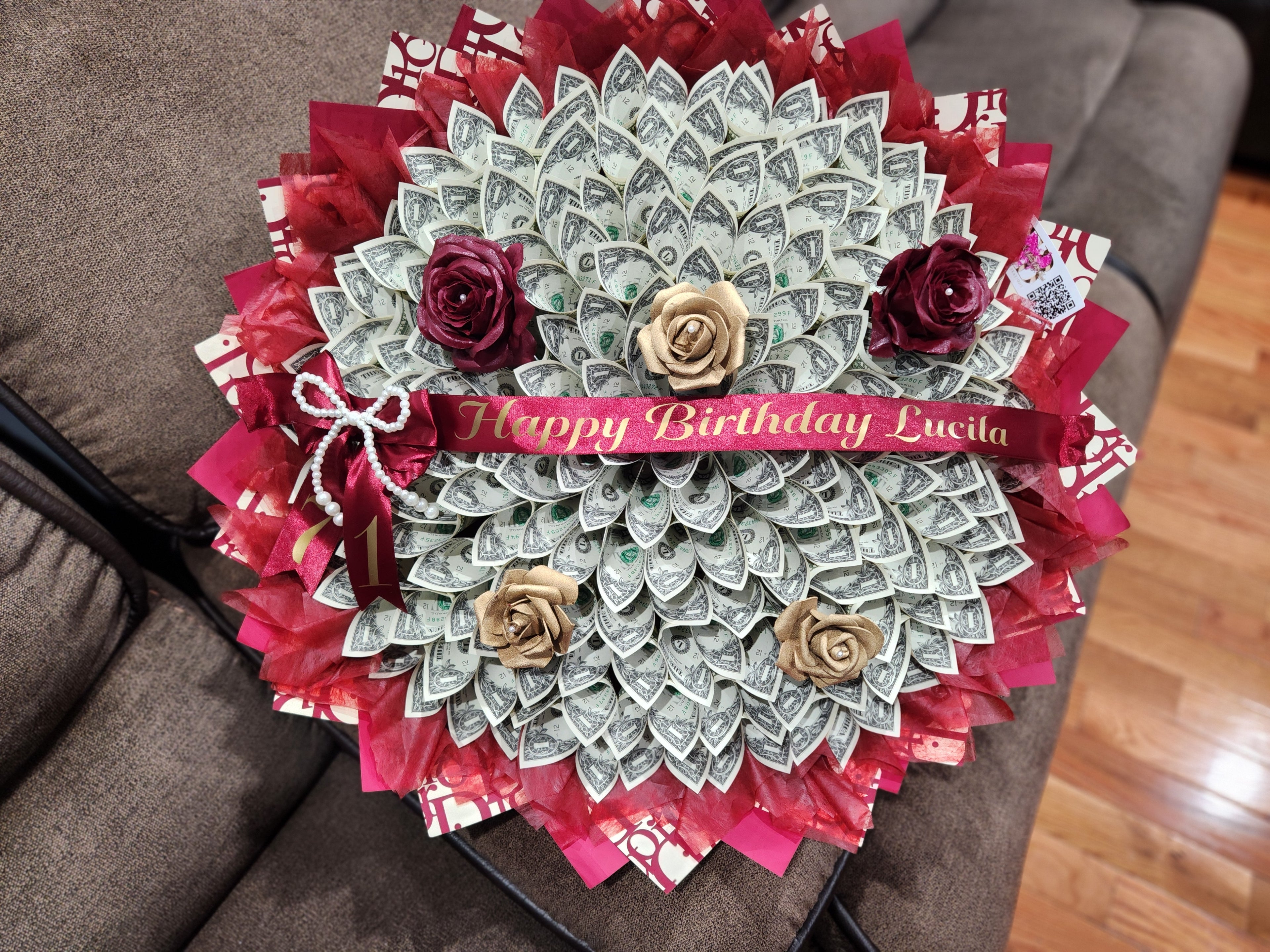 Discover a stunning blend of elegance and creativity with our custom money bouquets. Perfect for any occasion, these one-of-a-kind arrangements are designed to impress and leave a lasting impression. Each bouquet is carefully crafted to showcase beautifully folded real bills, artfully arranged with luxe florals and sophisticated details, making it a memorable gift that truly stands out. Additional accessories like stickers, tags, custom flower box and signs are also available for purchase to further personalize your bouquet.